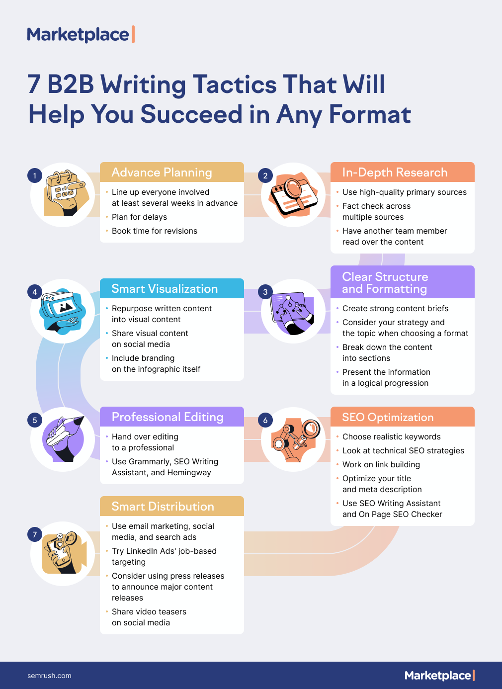 Here’s an example of a Visual Article from this Semrush blog post about ordering great copy, which uses a simple design to organize a collection of copywriting advice by category: