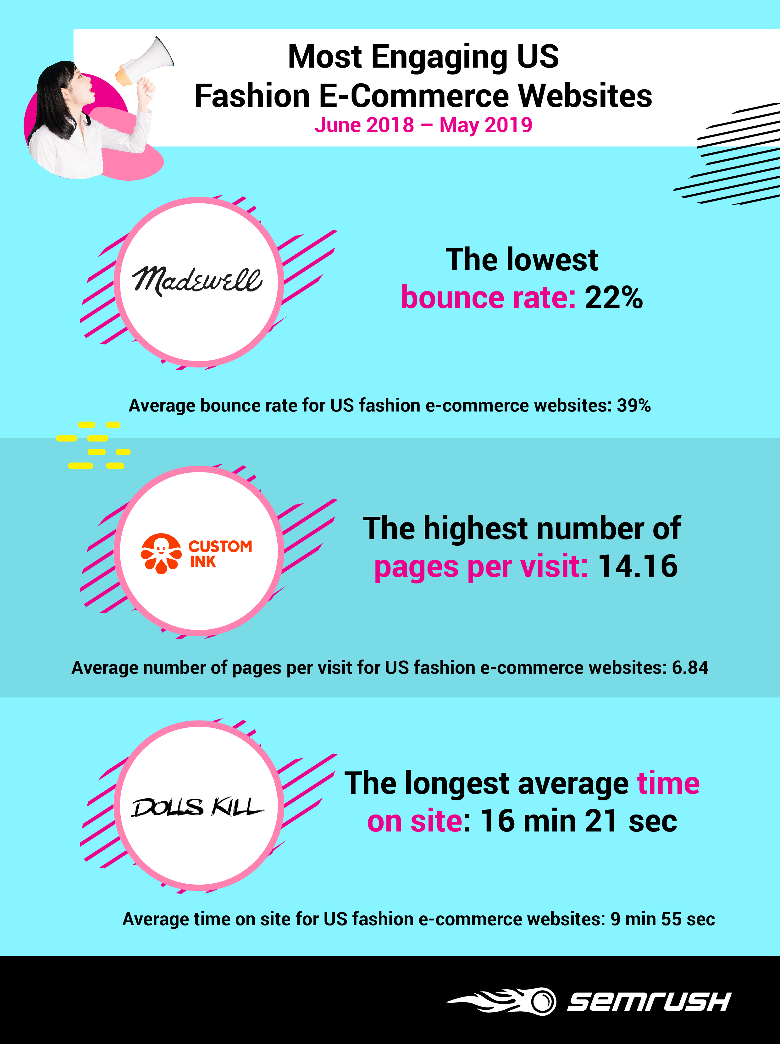 As we mentioned above, these are fashion ecommerce websites that received the largest amount of traffic in the US. The figures presented in the infographics are rounded and are sums of estimated monthly traffic received by each domain from June 2018–May 2019.