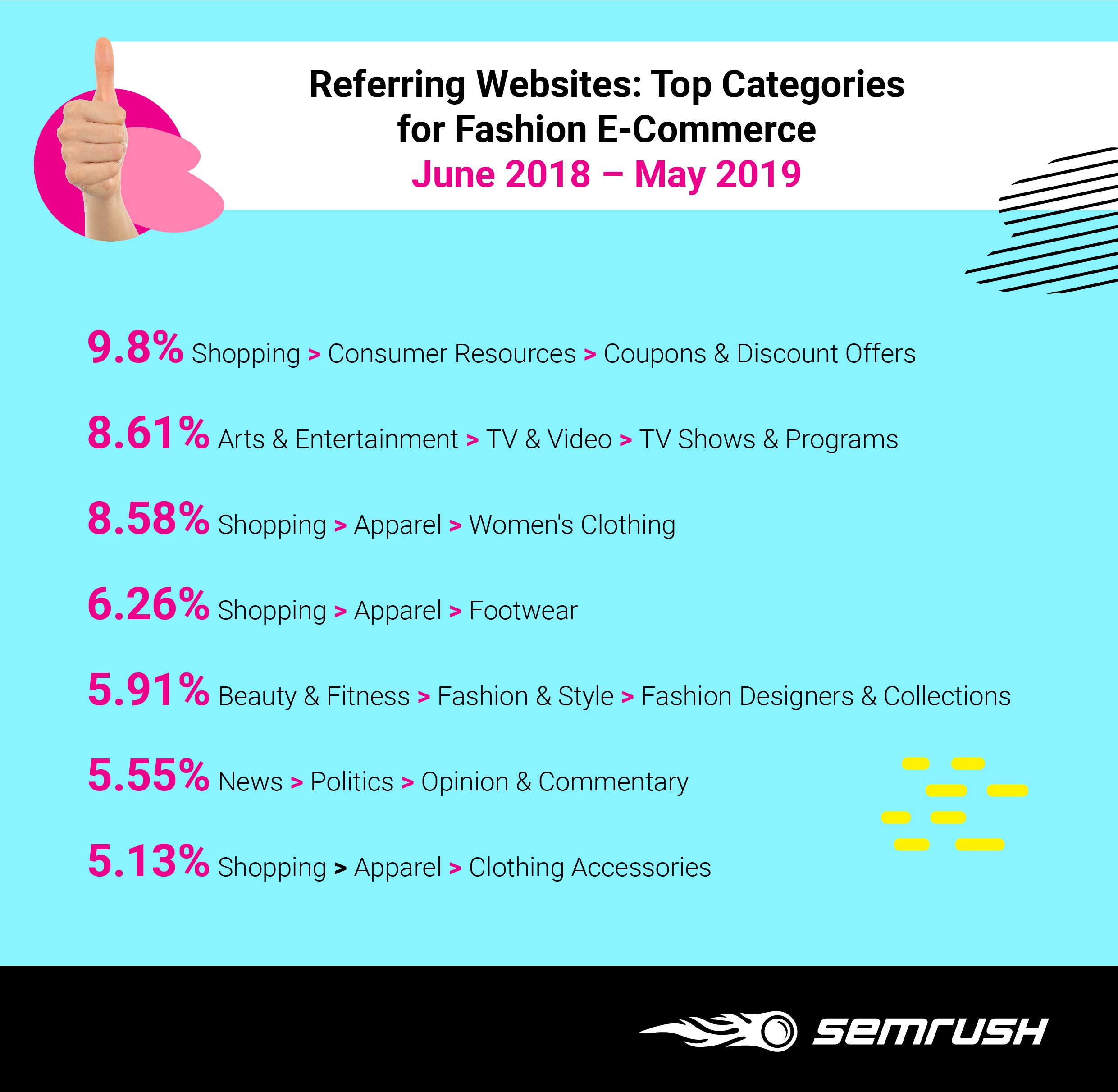 Referral traffic analysis reveals which external websites (referring domains) provide backlinks to the studied domains. We went further in our research to provide you with comprehensible categories of sites that drove the biggest amount of traffic to fashion e-tailers.
