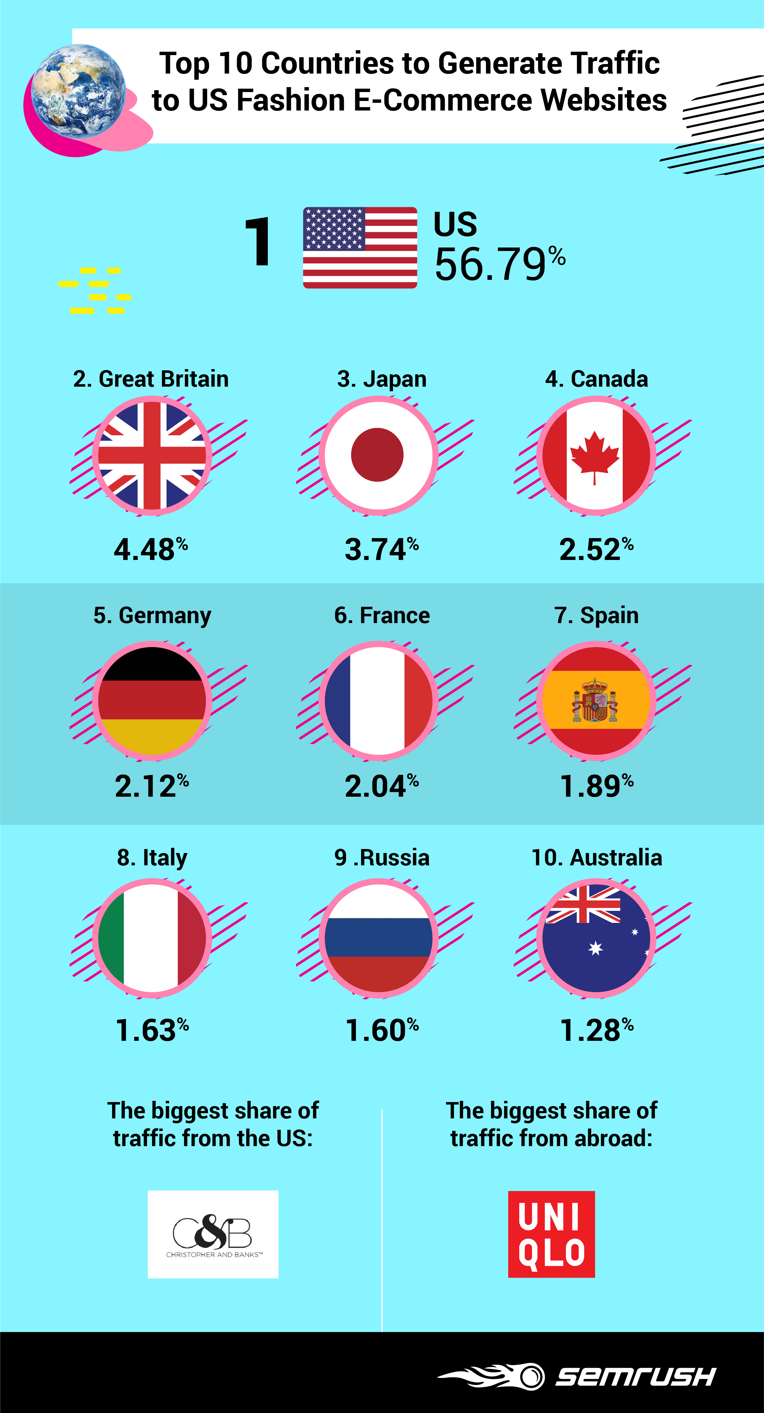 We did not make any distinction between sportswear and formal dresses online stores; we were neither interested in classifying ecommerces by their price range. We limited our list to the US as the set location and filtered out the top 130 fashion ecommerce websites that were most successful in generating traffic. All of the trends and specific rankings were put together from these 130 sites.