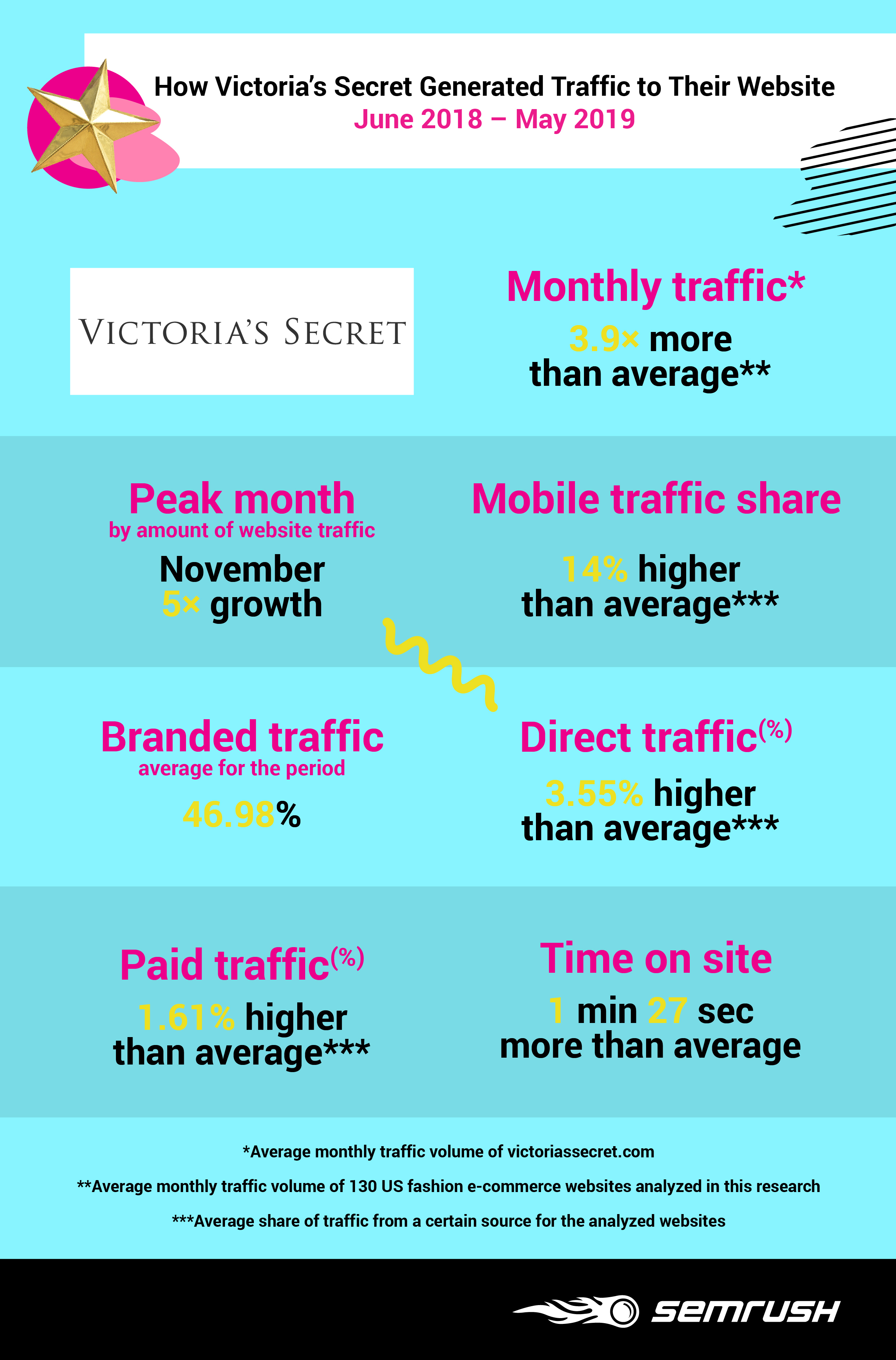 Traffic is definitely not everything you need. If we base the ranking on ecommerce net sales, it will look different: Macy’s will stay the leader (with almost 3.6 million dollars in 2018), but Victoria’s Secret will only be the 8th in the list (with about 1.2 million dollars in 2018). Nevertheless, if the aim of our research is discovering competitors’ digital marketing strategies, it is traffic that tells us the most.