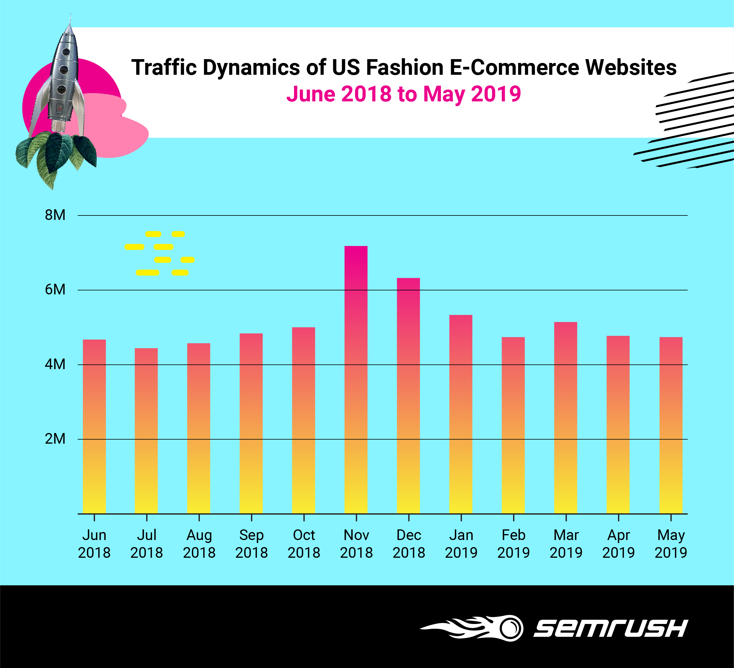 We first derived the average amount of traffic generated by 130 US fashion ecommerce websites monthly in June 2018–May 2019 to see the seasonal peaks typical for the whole industry in the region. The most visible increase of traffic was in November and is also the most evident one — Black Friday did its job for fashion e-tailers, as well as some early Christmas shopping. The change of seasons helped online stores in September, as well as drew some extra visitors in March.